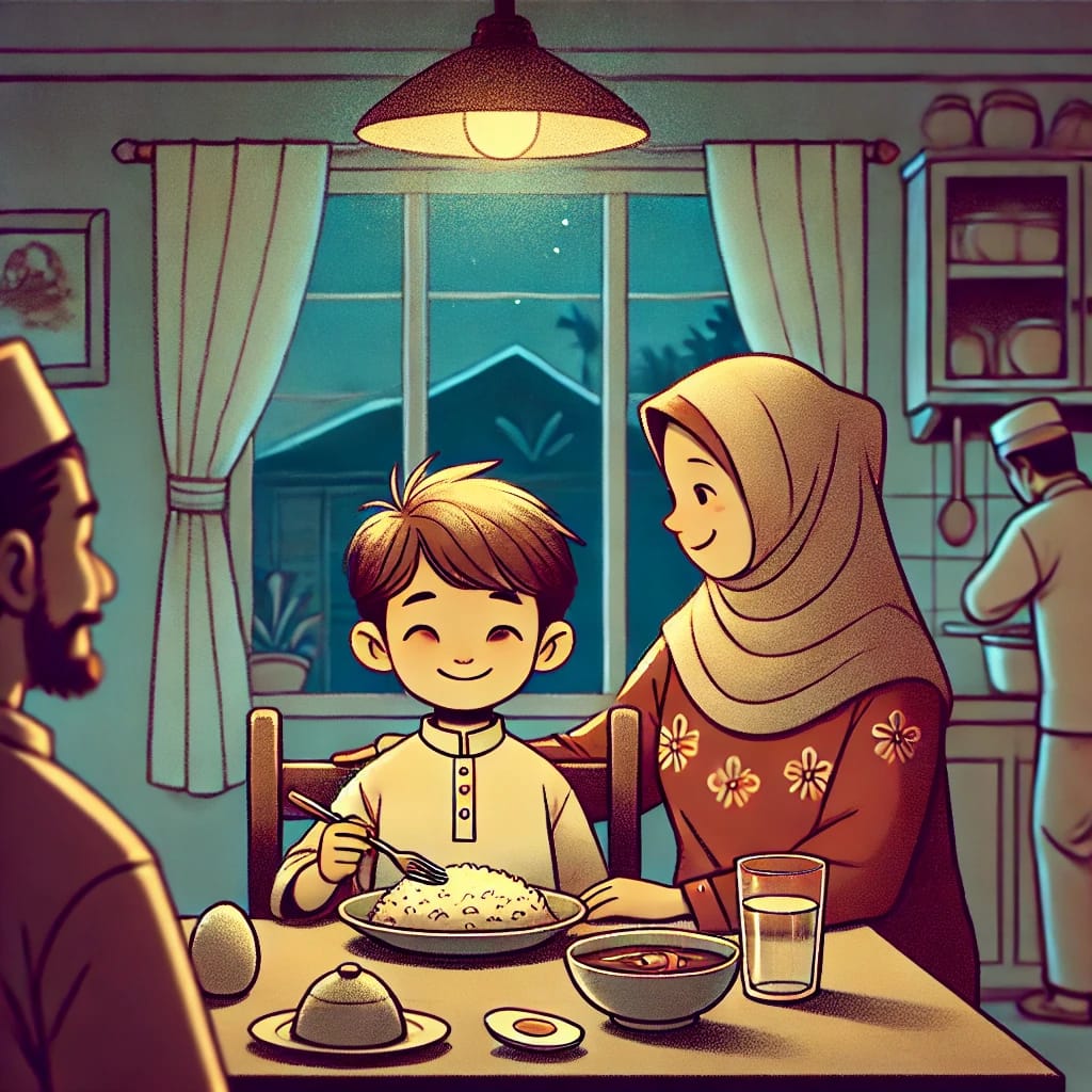 Suatu pagi, suara lembut Ibu membangunkan Rafi. “Rafi, bangun, Nak. Sudah waktunya sahur,” kata Ibu sambil mengusap kepala Rafi. Rafi mengucek matanya yang masih berat, tetapi ia segera bangkit. Di meja makan, sudah terhidang nasi hangat, sayur sup, dan telur dadar kesukaannya.