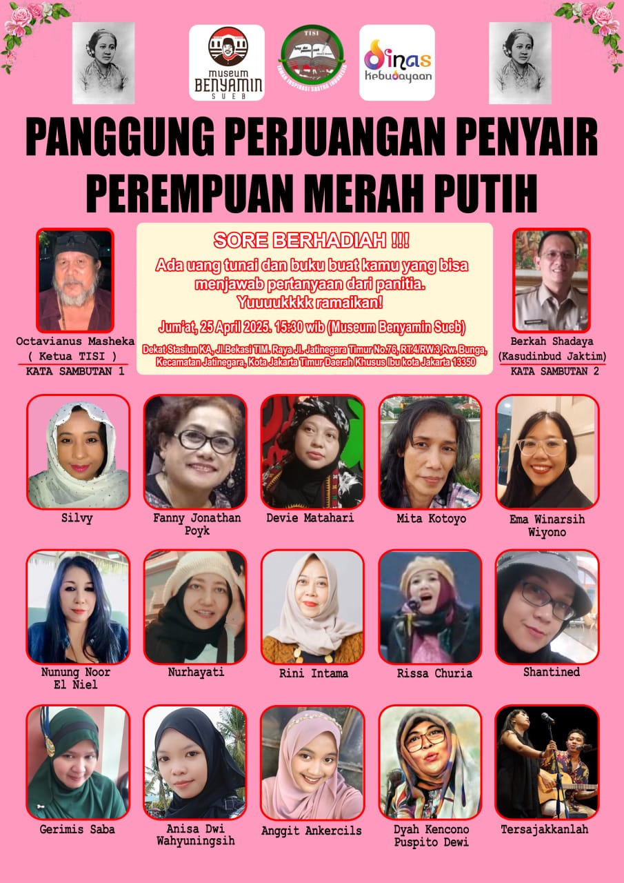 Bakal menggelar panggung perjuangan penyair perempuan merah putih di Museum.Benyamin Sueb- seberang Stasiun KA Jatinegara- Jakarta Timur pada Jumat , 25 April 2025 mulai.pukul 15.30 WIB.